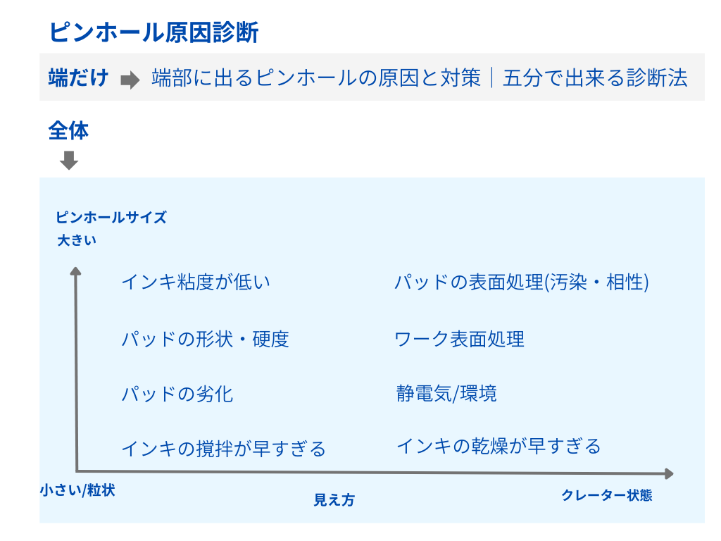 全体ピンホールはインキ状態、ワーク表面、印刷環境など工程全体の影響を受ける傾向があります。