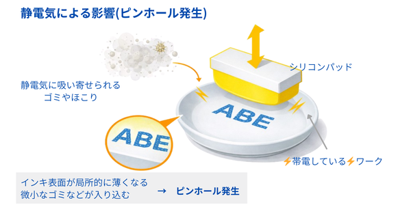 パッド形状や硬度、印圧がワーク形状にに適していない場合、インキ転写が均一にならずピンホールが発生することがあります。また、表面の汚れ(主に埃や、樹脂カス等)も転写不良の原因になります。