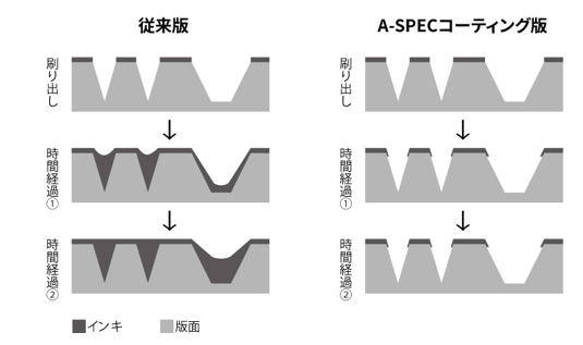 樹脂版の表面に極めて薄いコーティング被膜を形成し、インキの不要な堆積を防ぐ技術です。