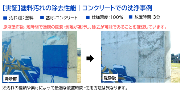 コンクリートに付着した塗料や落書きに対しても、短時間で浸透・剥離し除去可能です。